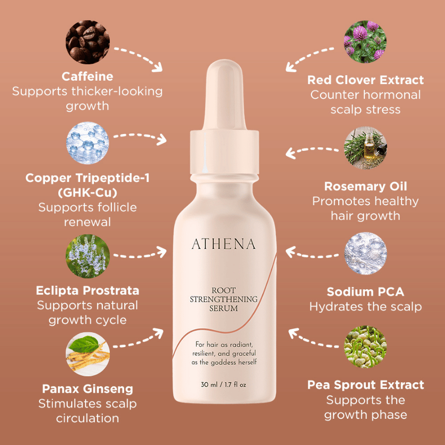 The Athena Root Strengthening Serum was created to help women reclaim the strength, density, and shine their hair once had naturally.